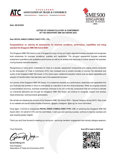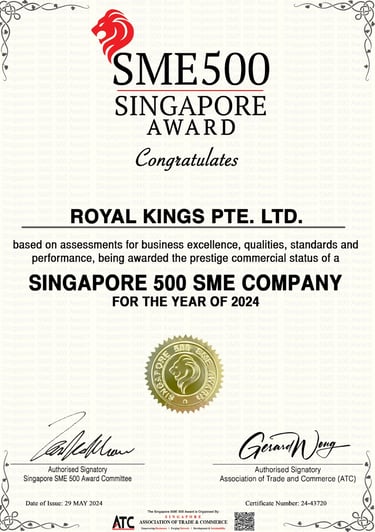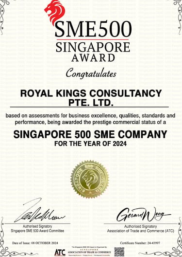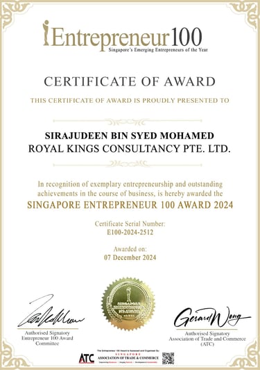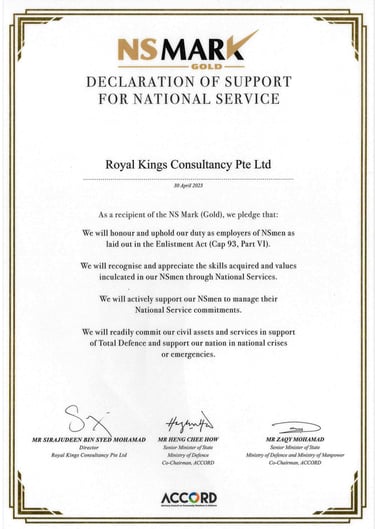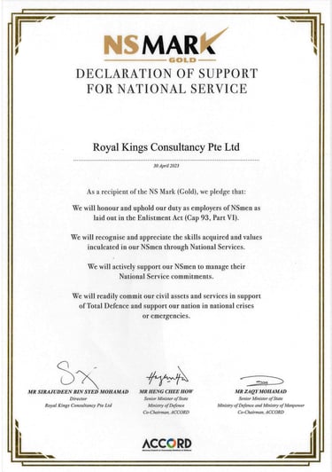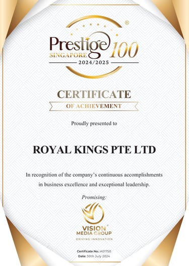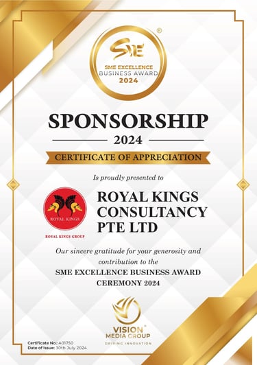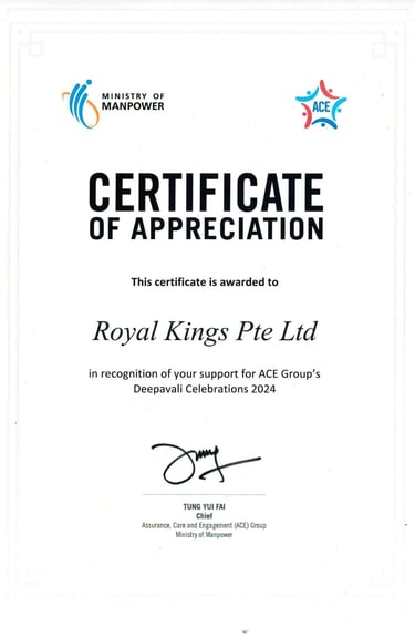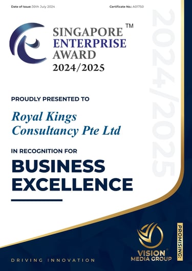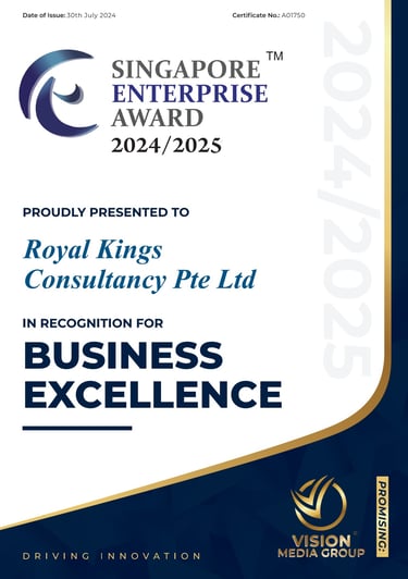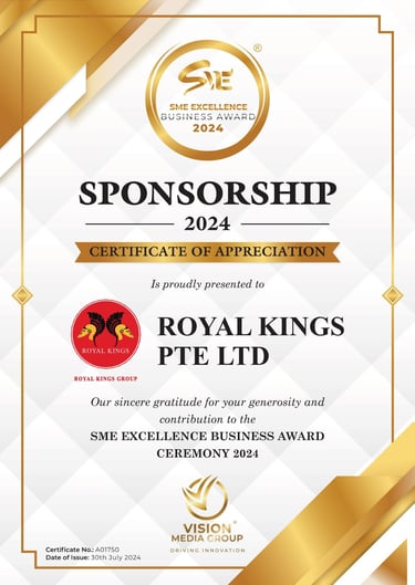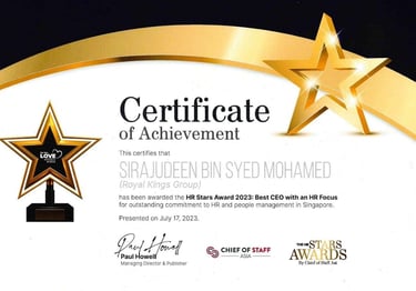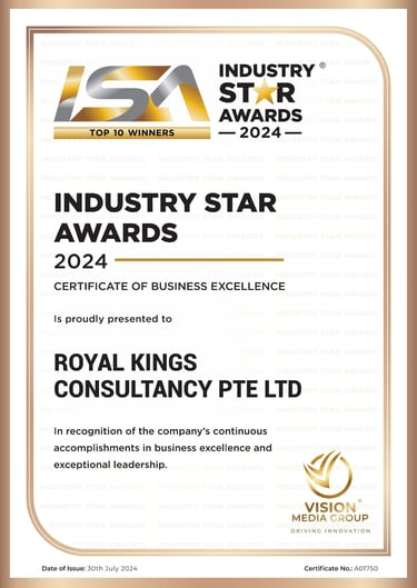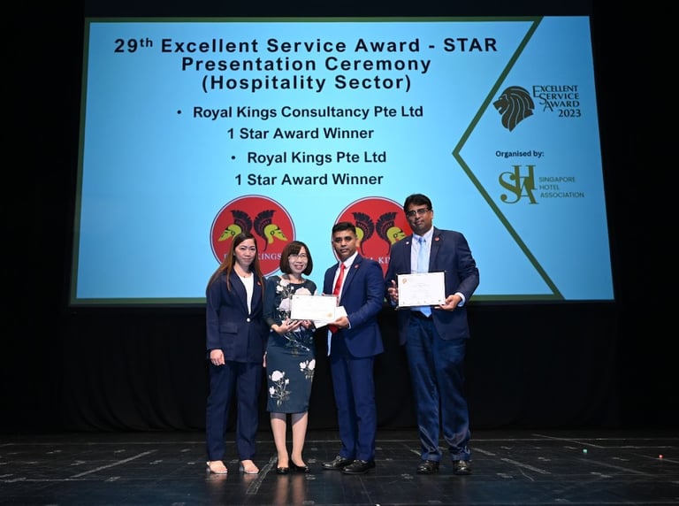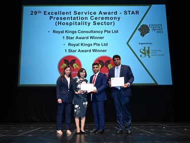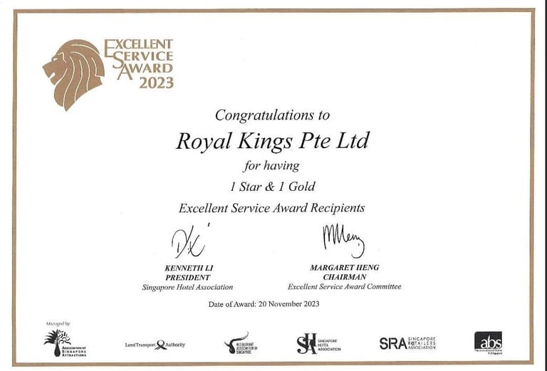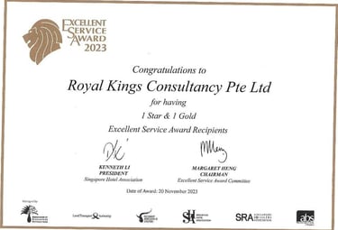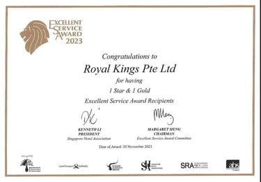 Excellent Service Award - Star - 2023 Singapore Hotel Association Awarded by Ms Margaret Heng Chairman Excellent Service Award Committe -ROYAL KINGS CONSULTANCY PTE. LTD.