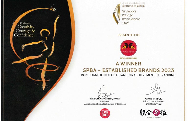 Singapore Promising Brand Award - Established Brand Award - 2023 Awarded to Royal King Group by Mr Gan Kim Yong Minister for Trade and Industry of Singapore