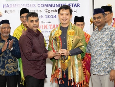 Minister of State, Ministry of Culture, Community and Youth & Ministry of Trade and Industry Mr Alvin Tan, Grassroots Advisor and Member of Parliament for Tanjong Pagar GRC giving token of appreciation to Royal Kings Group for generous Sponsorship of the FSIM Harmonious Community Iftar on 24th March 2024 @Bencoolen Masjid.