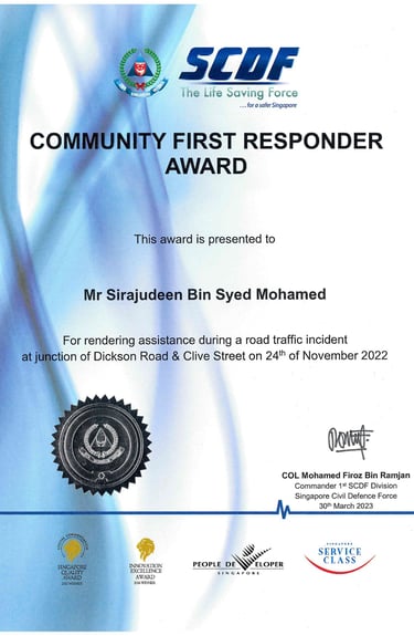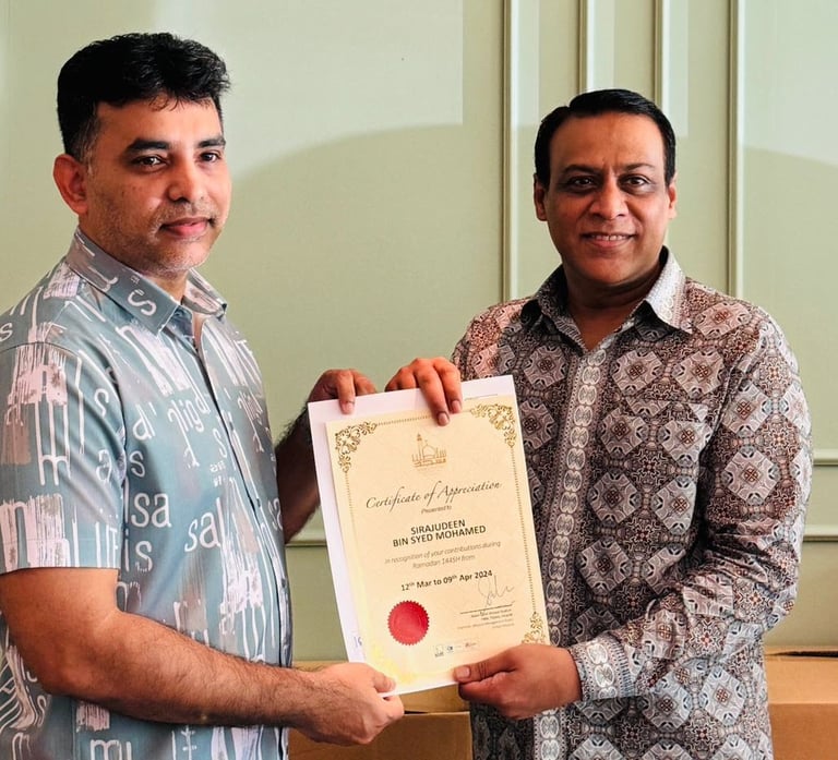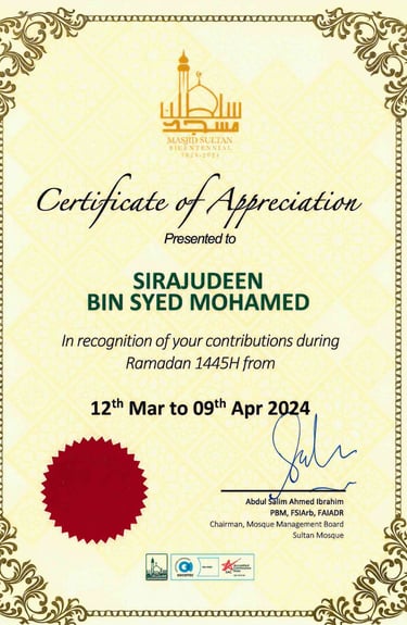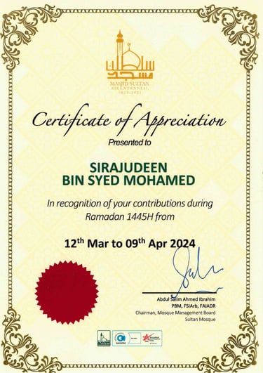 Awarded by Chairman Of Sultan Mosque, Haji Abdul Salim Ahmed Ibrahim PBM FSIArb,FAIADR for Our Contributions during Ramadan to Masjid Sultan - 2024
