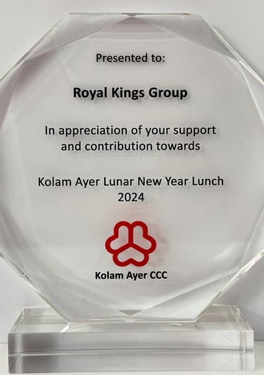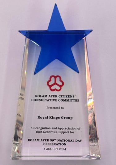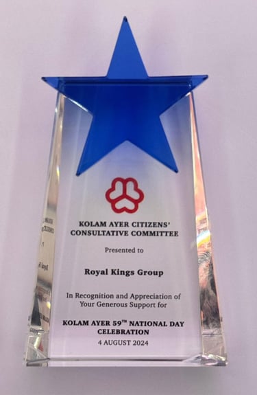KOLAM AYER 59th National Day Celebration Royal Kings Group received a prestigious recognition from the Kolam Ayer Citizens' Consultative Committee. This esteemed award was presented by Ms. Josephine Teo, Minister for Digital Development and Information, and Second Minister for Home Affairs and Minister-in-charge of Smart Nation and Cybersecurity, along with Dr. Wan Rizal, Adviser to Jalan Besar GRC and GROs