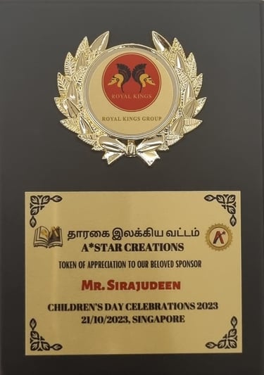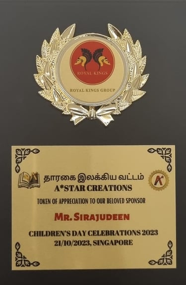 A* STAR CREATIONS TOKEN OF APPRECIATION CHILDREN'S DAY CELEBRATIONS - 2023 In the presence of Mr R. Dhinakaran former Nominated Member of Parliament (NMP) and IMMEDIATE PAST PRESIDENT Singapore Retailers Association (SRA)