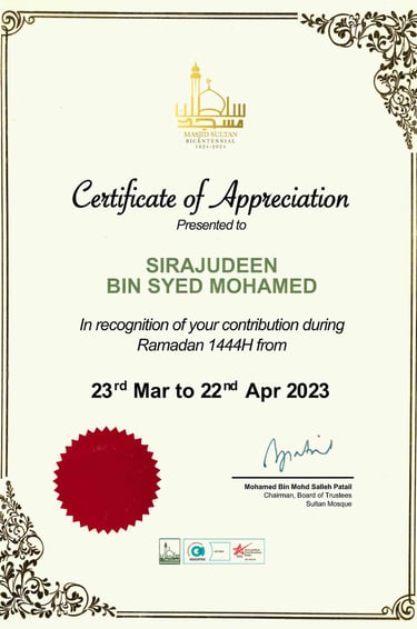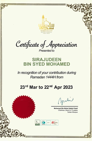 Awarded by Chairman Of Sultan Mosque and Chairman of the mosque's board of trustees, Mr Mohamed Patail for Our Contributions during Ramadan to Masjid Sultan - 2023
