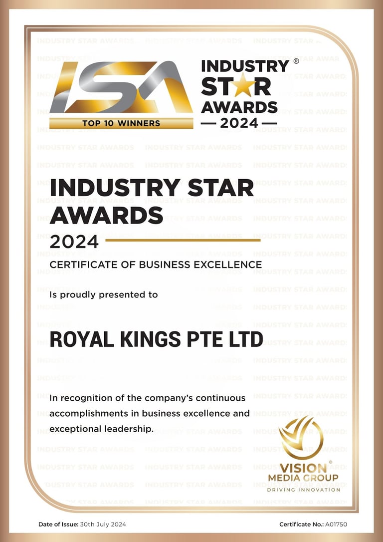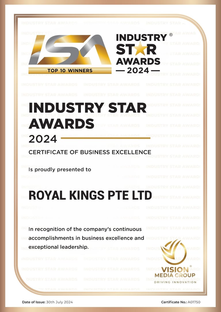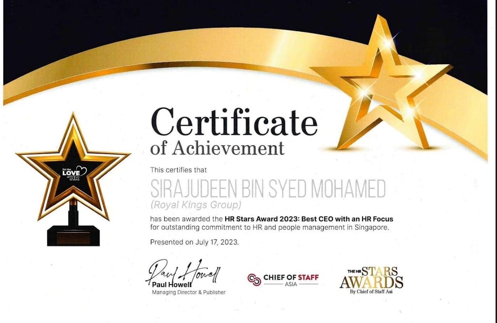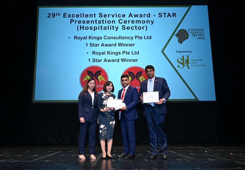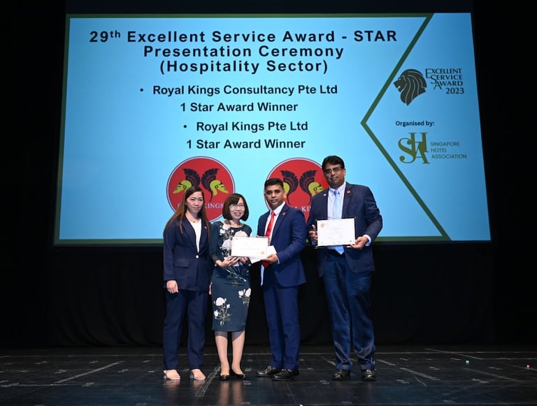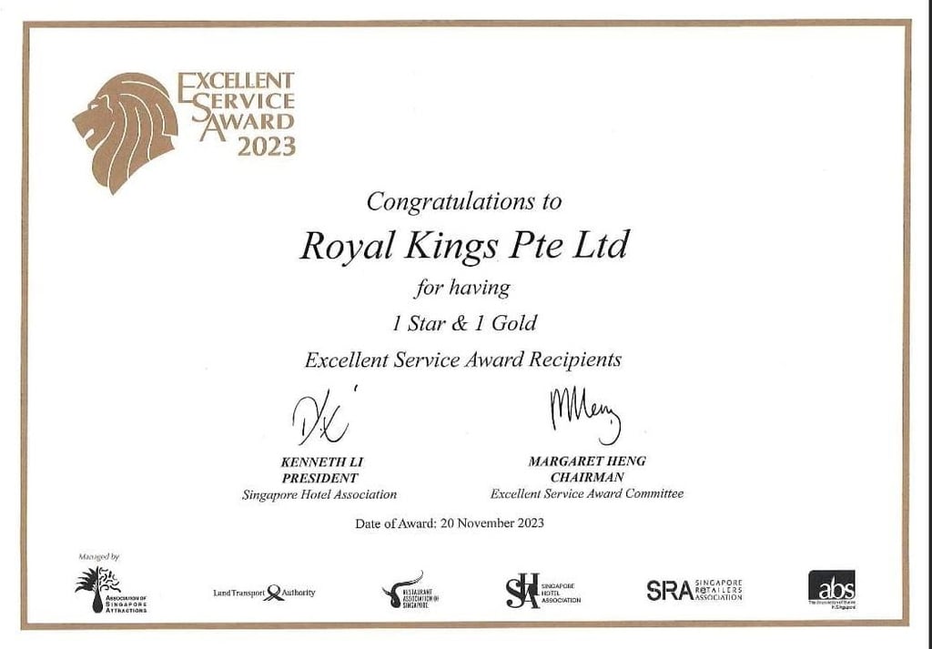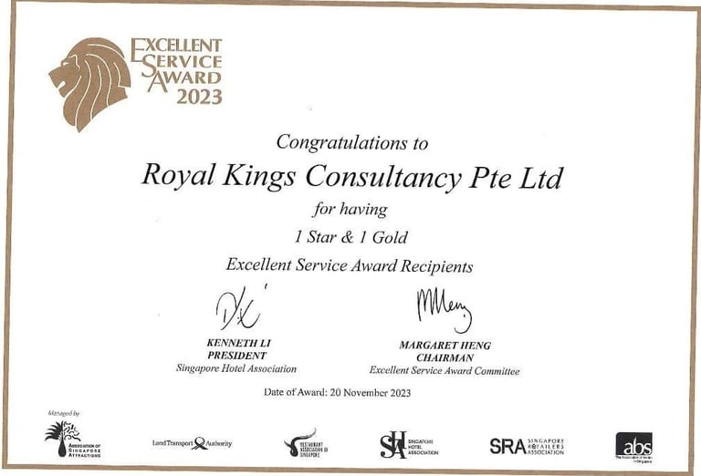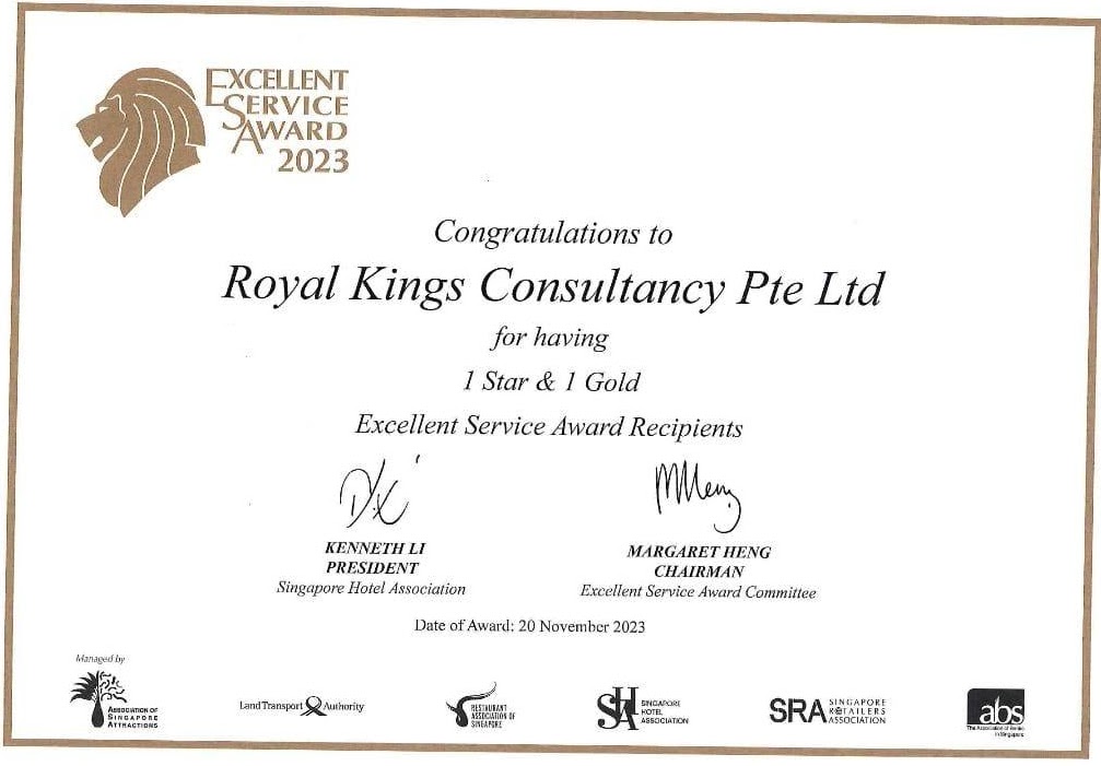 Excellent Service Award - Star - 2023 Singapore Hotel Association Awarded by Ms Margaret Heng Chairman Excellent Service Award Committe -ROYAL KINGS CONSULTANCY PTE. LTD.