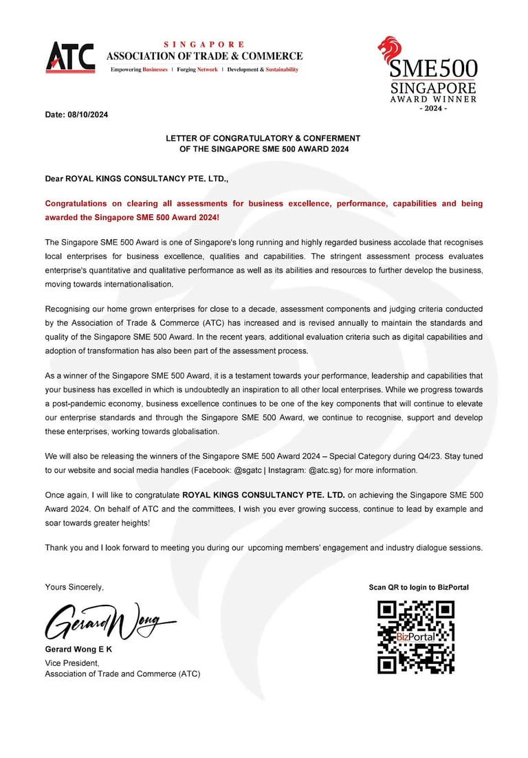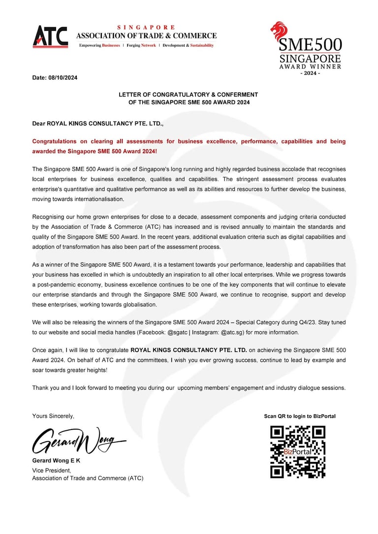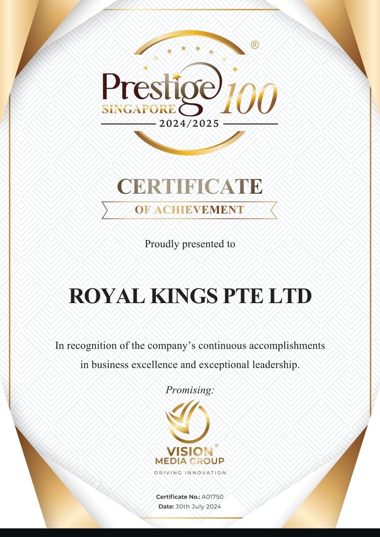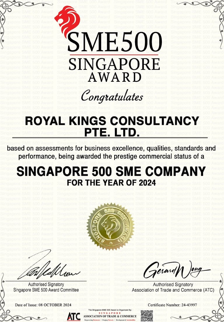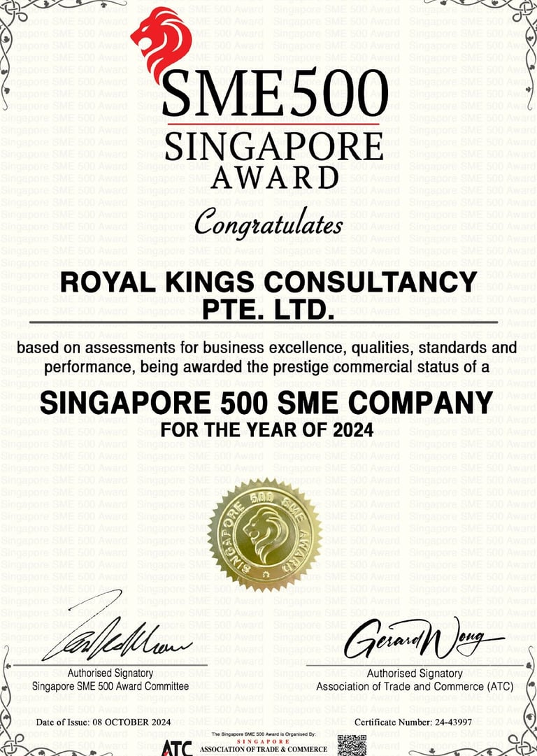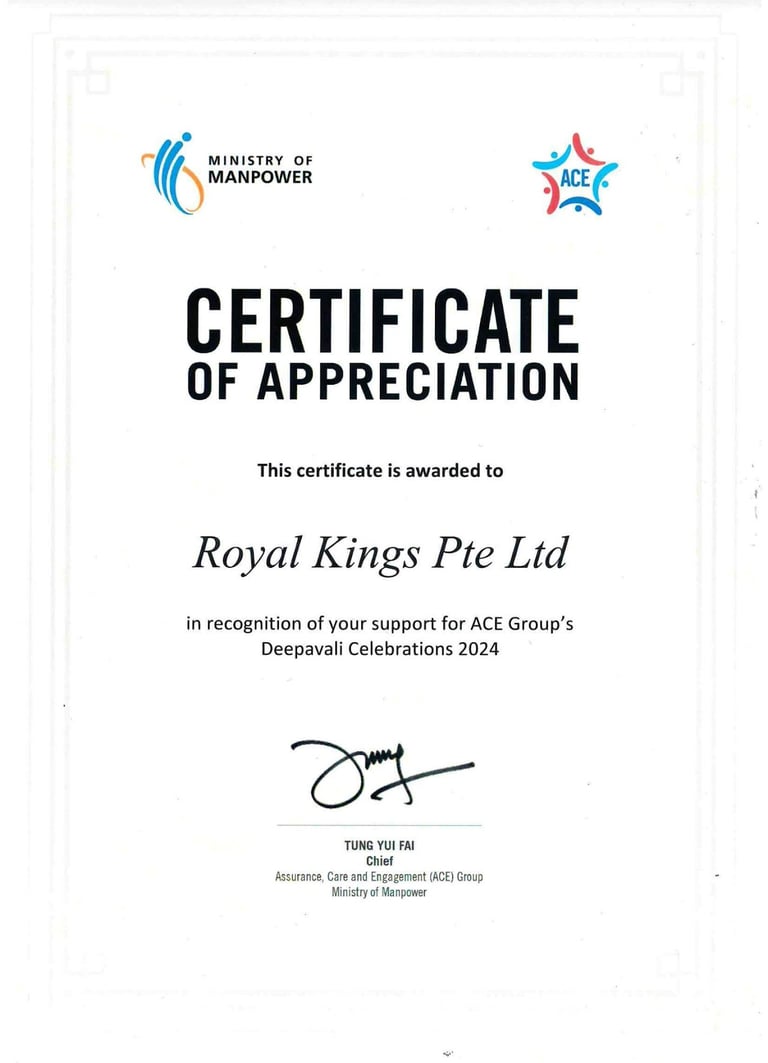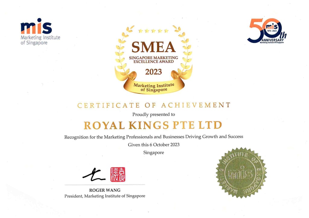 Excellent Service Award - Star - 2023 Singapore Hotel Association Awarded by Ms Margaret Heng Chairman Excellent Service Award Committe -ROYAL KINGS CONSULTANCY PTE. LTD.