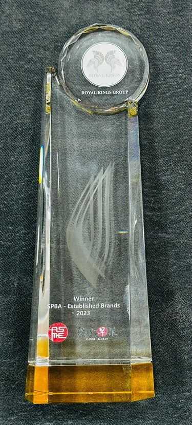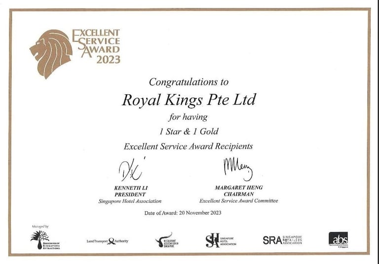 Excellent Service Award - Star - 2023 Singapore Hotel Association Awarded by Ms Margaret Heng Chairman Excellent Service Award Committe -ROYAL KINGS PTE. LTD.