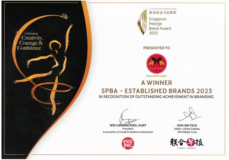 Singapore Promising Brand Award - Established Brand Award - 2023 Awarded to Royal King Group by Mr Gan Kim Yong Minister for Trade and Industry of Singapore