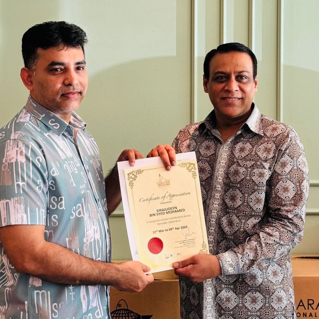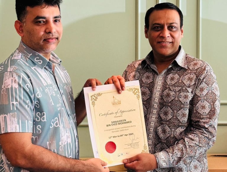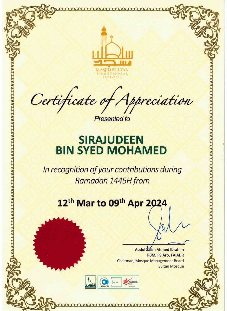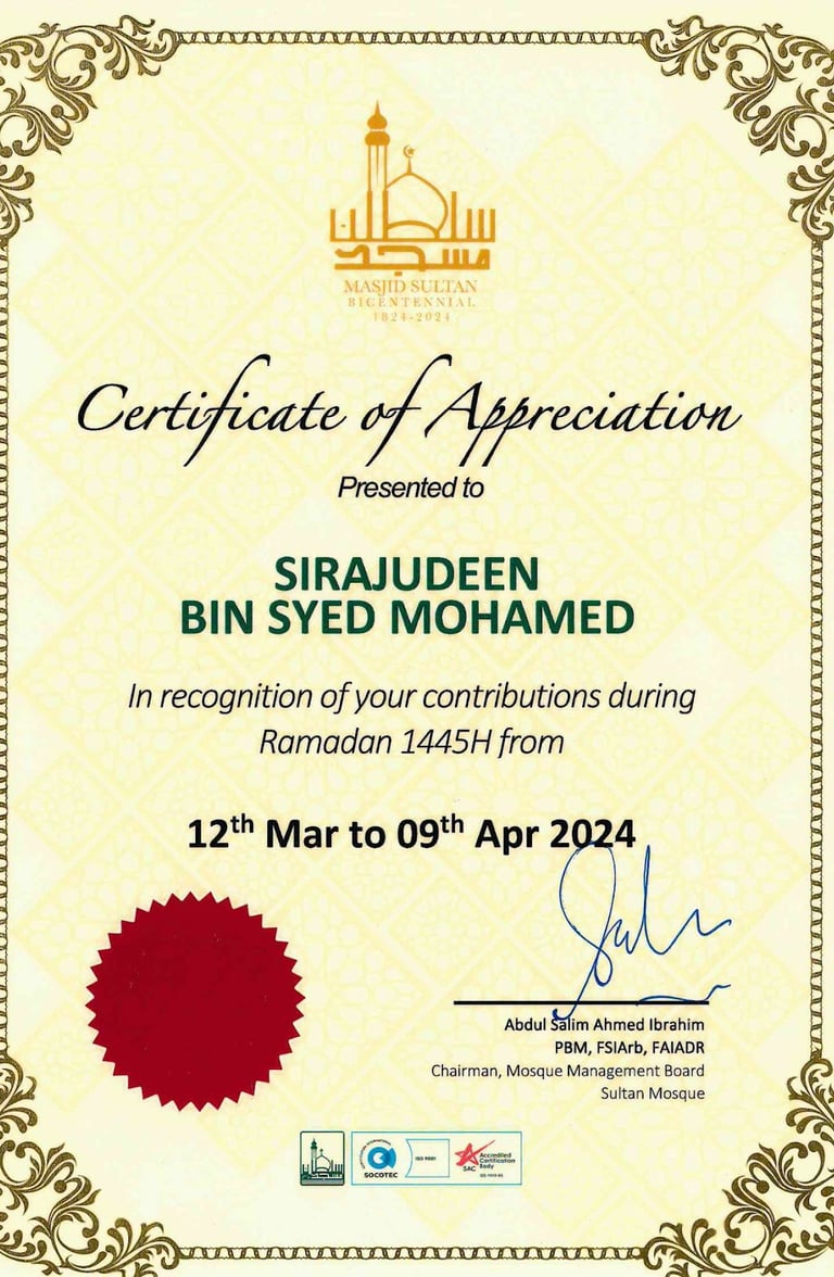 Awarded by Chairman Of Sultan Mosque, Haji Abdul Salim Ahmed Ibrahim PBM FSIArb,FAIADR for Our Contributions during Ramadan to Masjid Sultan - 2024