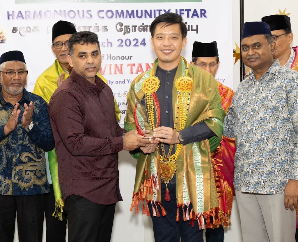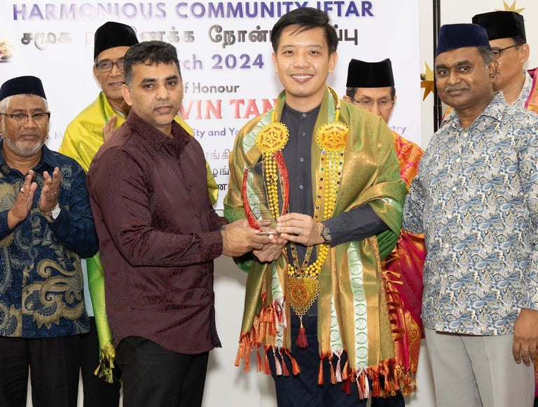 Minister of State, Ministry of Culture, Community and Youth & Ministry of Trade and Industry Mr Alvin Tan, Grassroots Advisor and Member of Parliament for Tanjong Pagar GRC giving token of appreciation to Royal Kings Group for generous Sponsorship of the FSIM Harmonious Community Iftar on 24th March 2024 @Bencoolen Masjid.