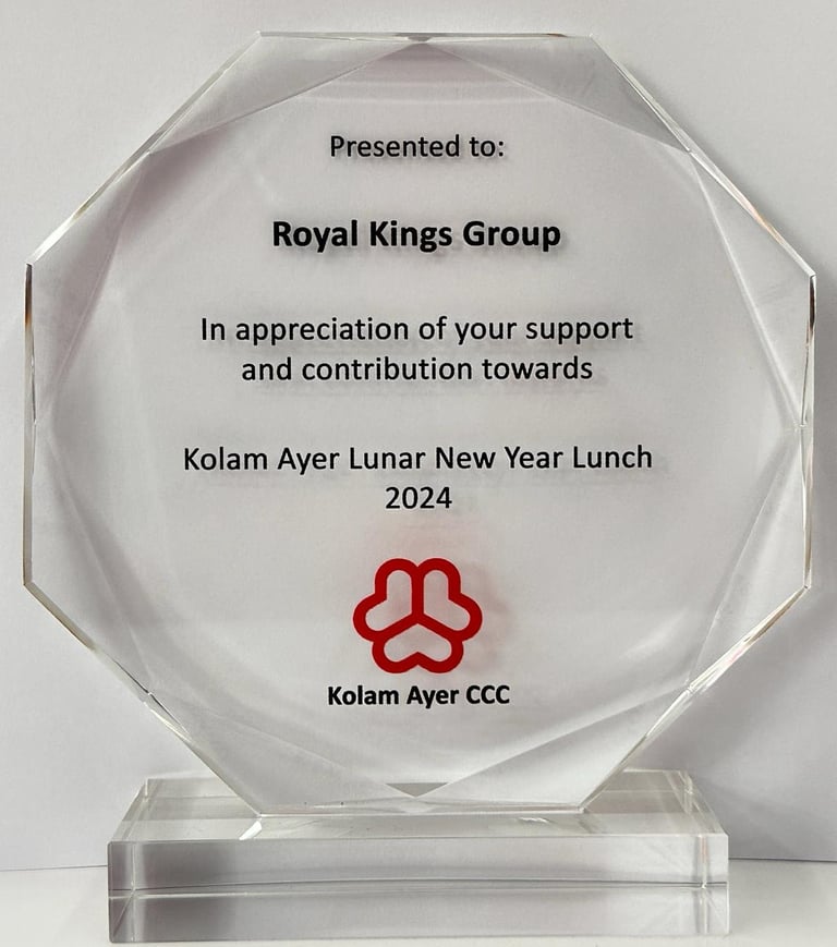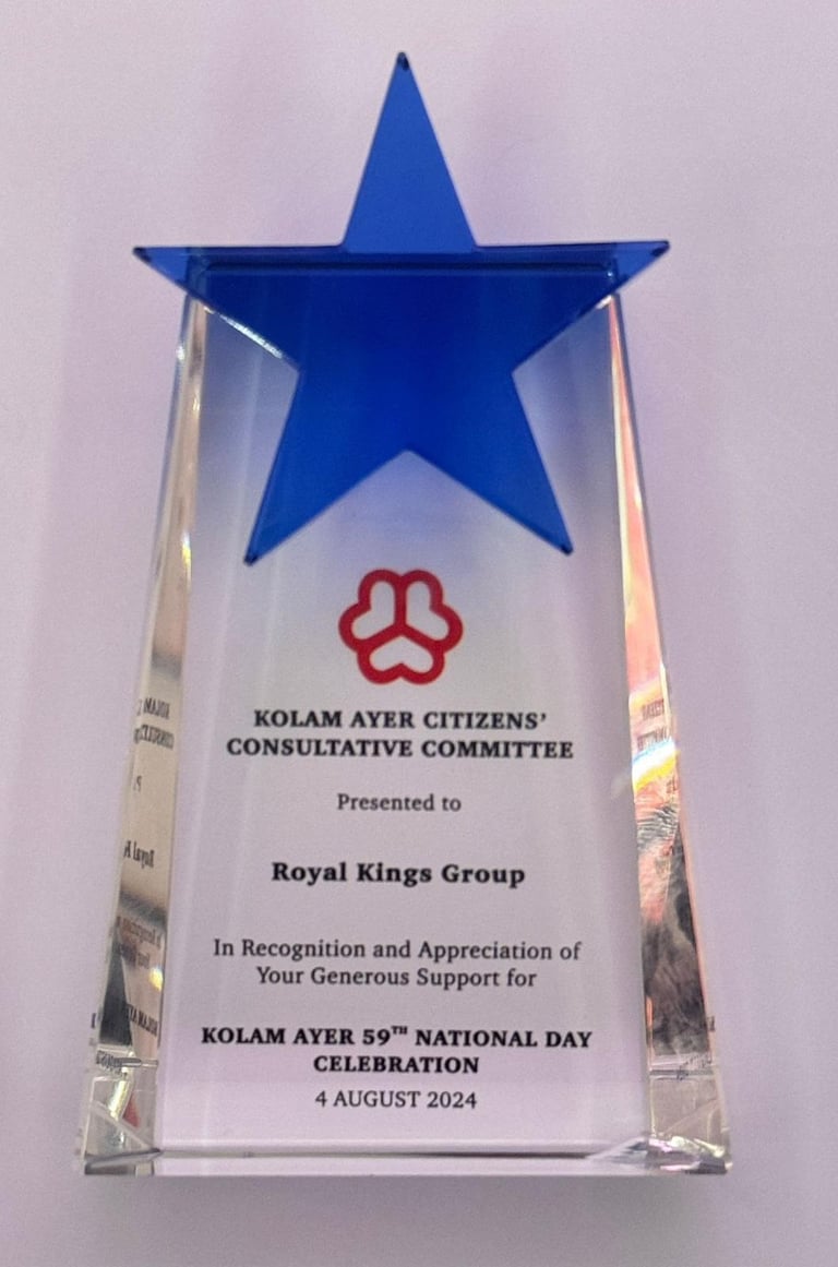 KOLAM AYER 59th National Day Celebration Royal Kings Group received a prestigious recognition from the Kolam Ayer Citizens' Consultative Committee. This esteemed award was presented by Ms. Josephine Teo, Minister for Digital Development and Information, and Second Minister for Home Affairs and Minister-in-charge of Smart Nation and Cybersecurity, along with Dr. Wan Rizal, Adviser to Jalan Besar GRC and GROs