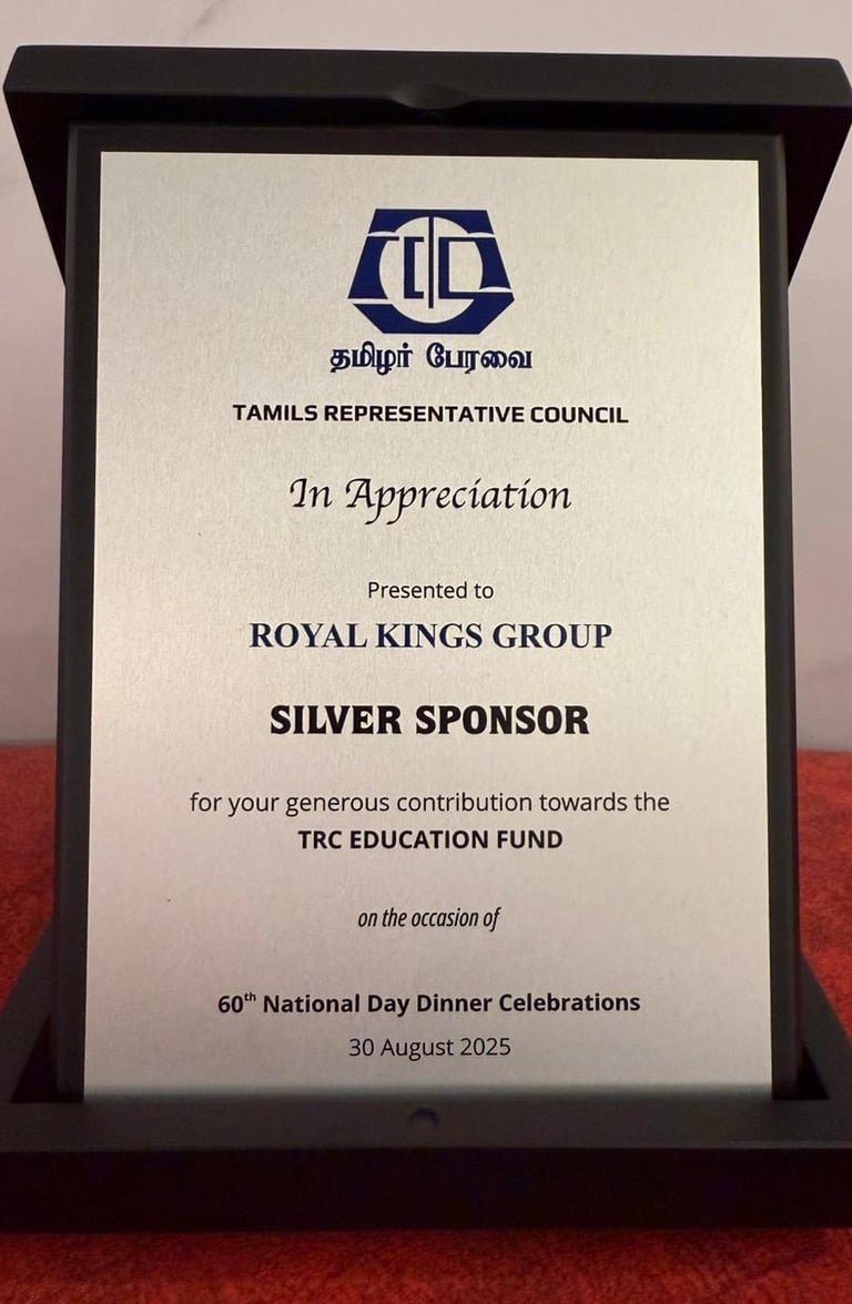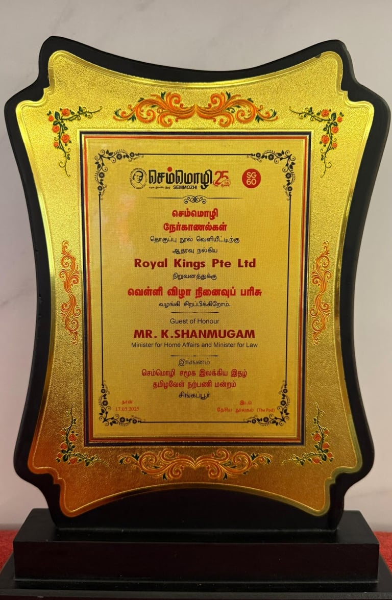 Royal Kings Group is truly humbled to be acknowledged for our contributions and support at செம்மொழி 25 (Semmozhi 25) — a Tamil cultural celebration born out of love for the Tamil language in Singapore, held in conjunction with SG60. This recognition was presented on 17 May 2025, in the esteemed presence of Guest of Honour, Mr. K. Shanmugam, Minister for Home Affairs and Minister for Law, and organised by the Semmozhi Social, Literary & Music Tamil Association, Singapore.For us, this meaningful honour is more than just recognition — it is a reaffirmation of our commitment to culture, heritage, and community.